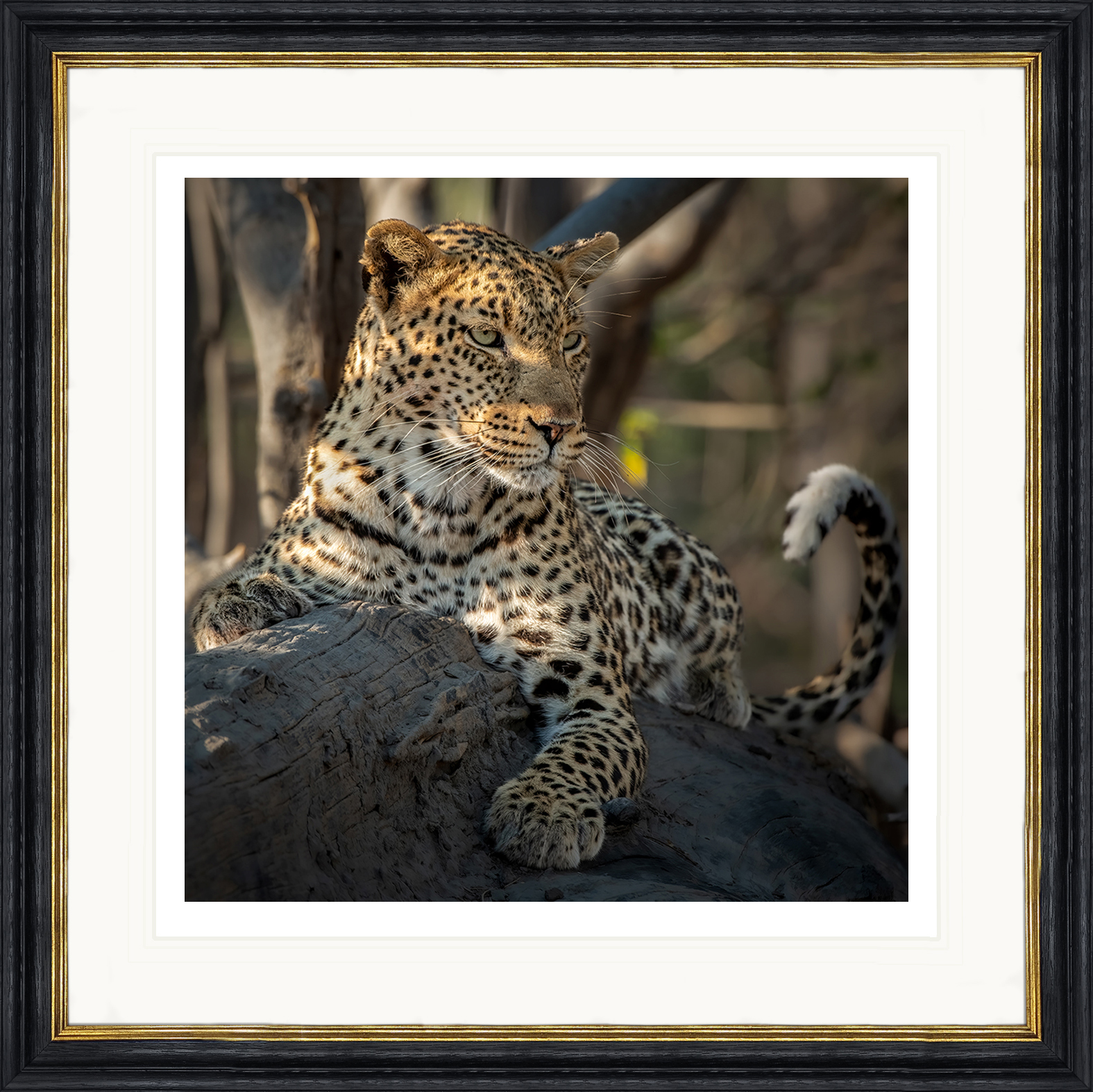 This breath taking limited-edition Giclée print showcases a magnificent leopard. It rests elegantly on a dark, weathered log, its gaze directed thoughtfully towards the horizon. The warm, golden light of the setting sun illuminates the scene.