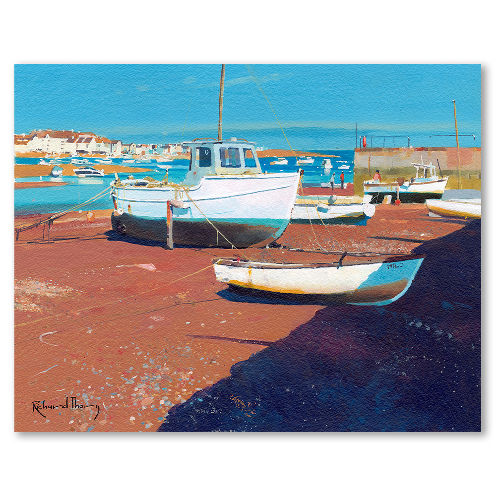 Richard Thorn’s “Afternoon at Shaldon” captures the serene beauty of a picturesque coastal village. The print bursts with colour, depicting boats resting on a sunlit shore. Thorn’s technique brings life to every detail, from the shimmering water to the rich textures of the sand.