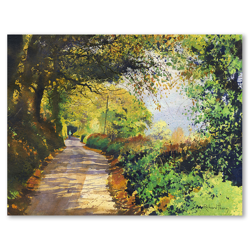 “Along the Ridge Road” by Richard Thorn beautifully evokes the charm of a countryside journey. This limited edition Giclée print draws you into a serene passage lined with overhanging trees. Thorn’s masterful brushwork highlights the interplay of light and shade.