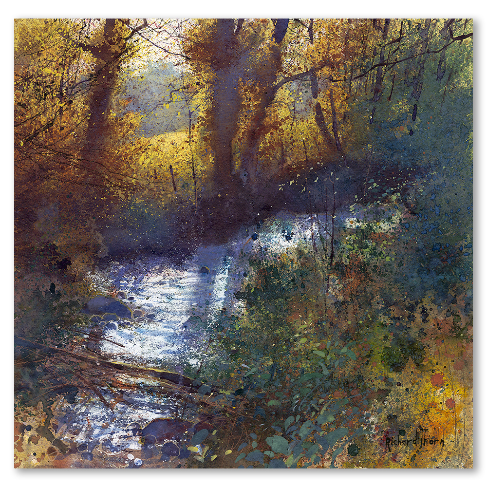 “Autumn Contra-Jour” by Richard Thorn beautifully captures the ethereal essence of fall. This limited edition Giclée print celebrates the play of light and shadow, immersing viewers in a magical woodland setting. Thorn’s artistic brilliance shines through in every detail.