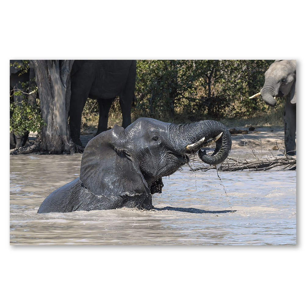 The artwork focuses on a single elephant. It is submerged in the water up to its neck. The elephant raises its trunk. It allows water to cascade down its face. In addition, other elephants can be seen in the background. They create a sense of community and belonging. The surrounding environment features trees. This indicates a lush watering hole in the wild.