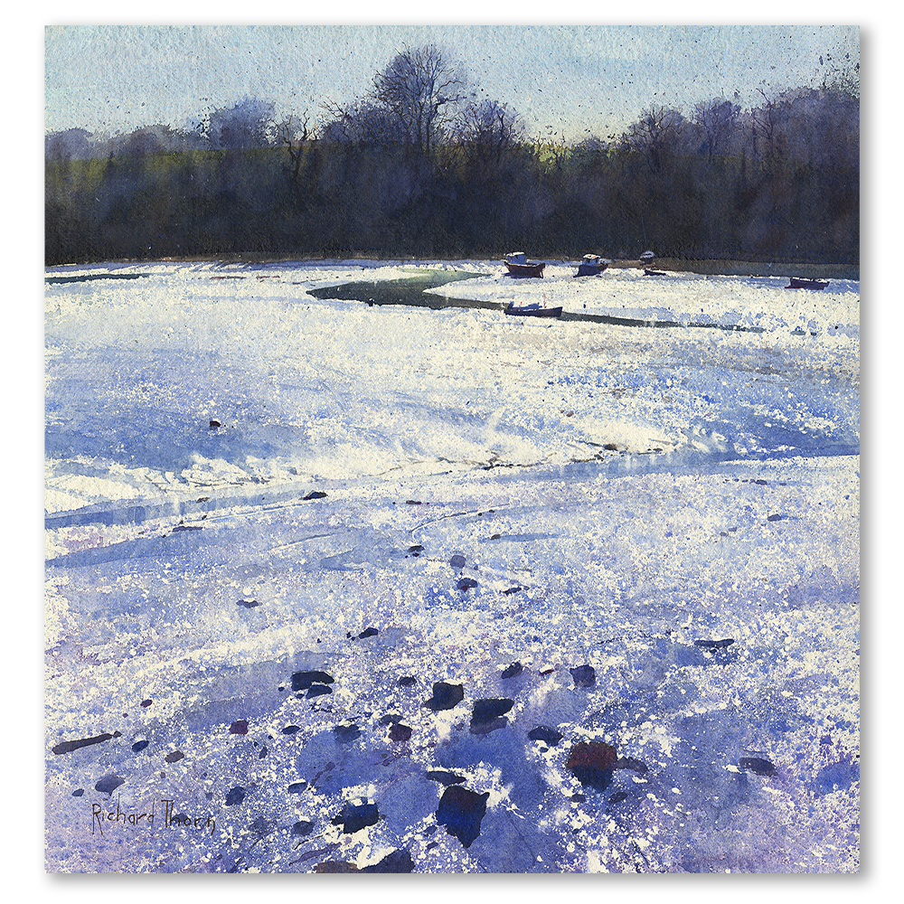 “Blue Creek” by Richard Thorn captures the raw beauty of a tidal riverbed. This limited edition Giclée print presents a stunning interplay of light and texture. Viewers are drawn into a world shaped by the gentle ebb and flow of tides.