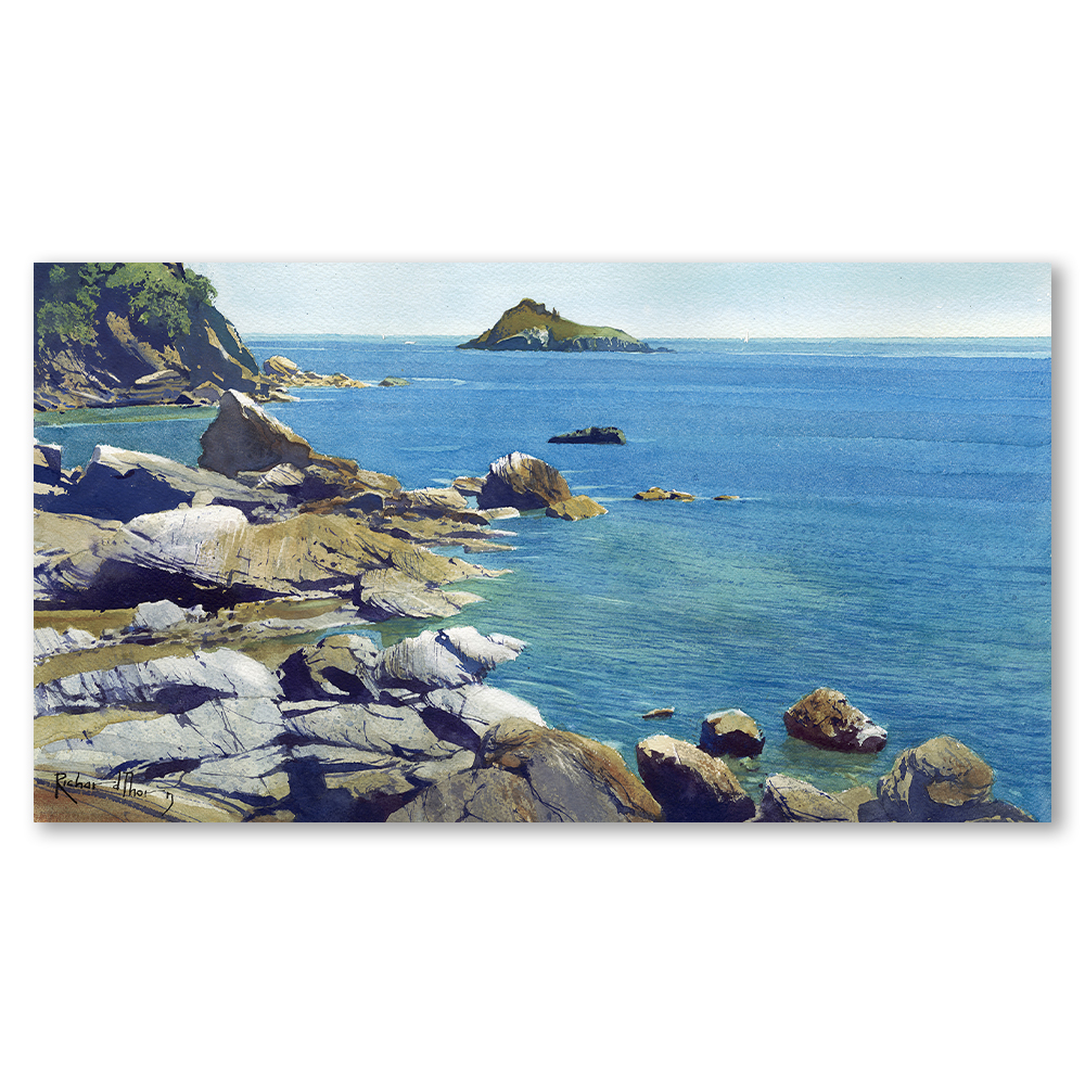Immerse yourself in the tranquil charm of “Calm Day Thatcher Rock,” a fine art limited edition Giclée print by Richard Thorn. This exquisite piece captures the nuanced interplay of light and shadow over the rugged coastline, drawing the viewer into a moment of peace and contemplation.