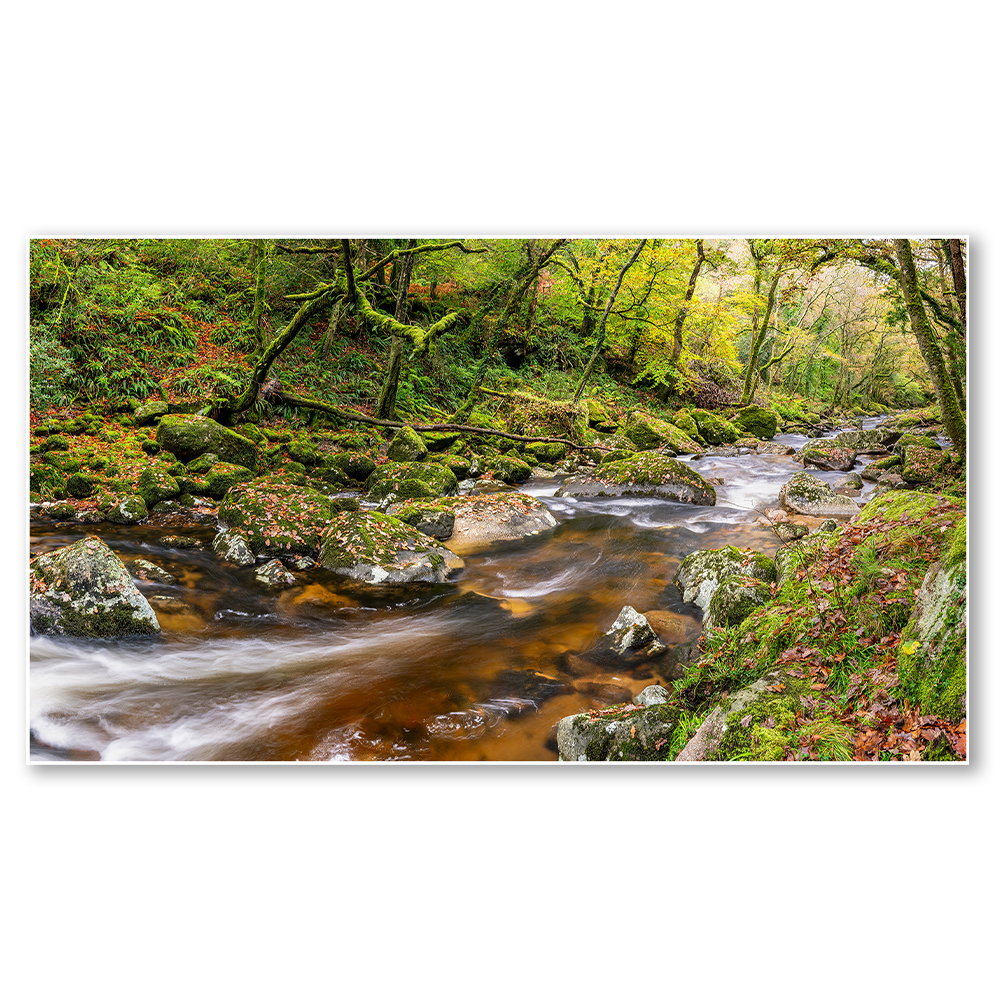 This stunning piece captures the essence of autumn in a vibrant woodland scene. A gently flowing stream meanders through a lush forest, its waters reflecting the warm hues of the season. Moss-covered rocks line the stream bed, adding texture and depth to the image. The overall effect is one of tranquility and natural beauty.