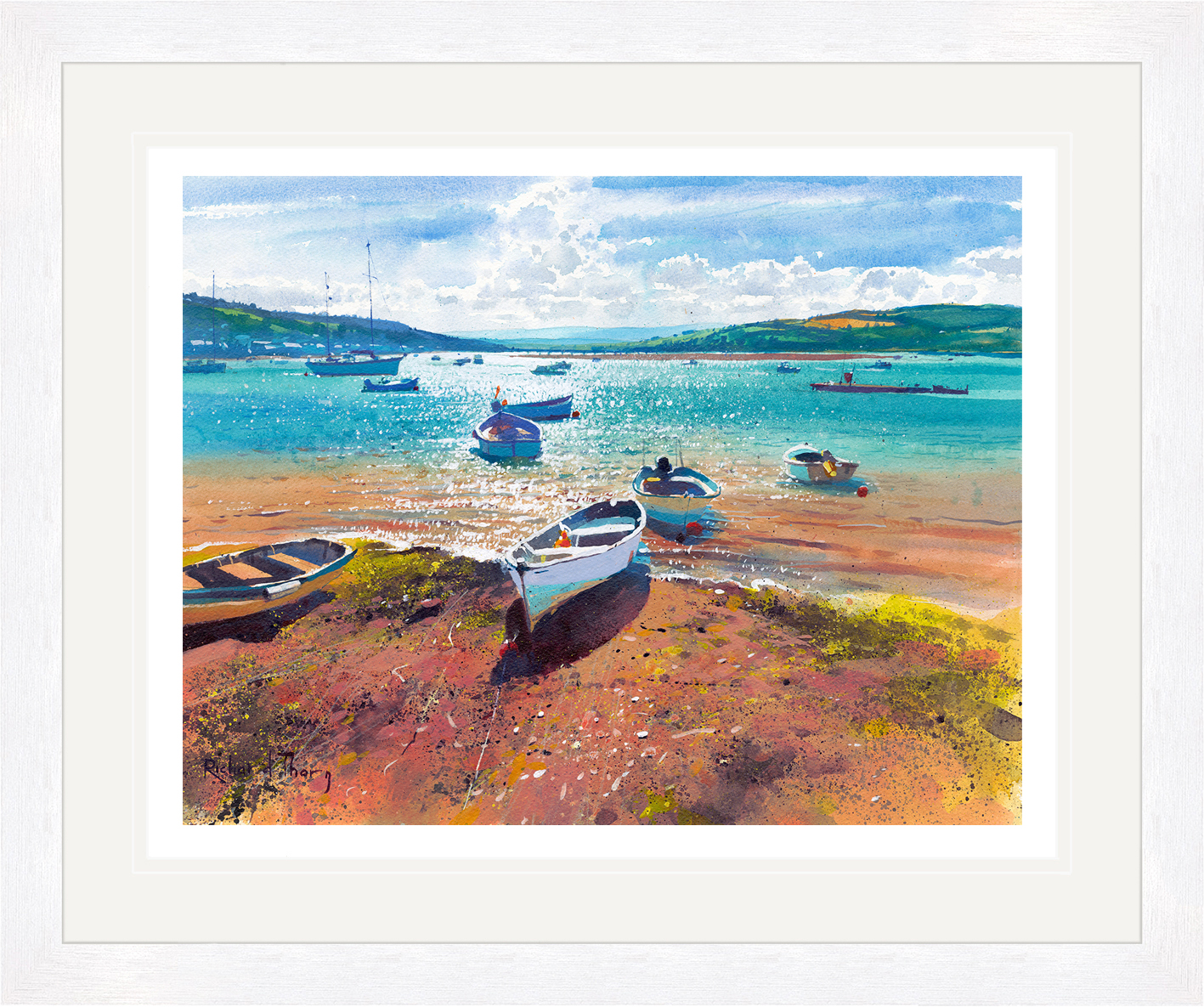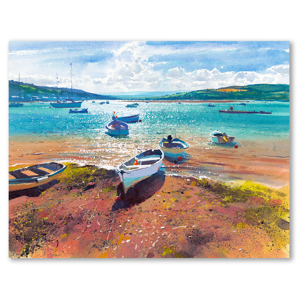 “Estuary Evening,” a limited edition Giclée print by Richard Thorn, captures the serene beauty of twilight over a quiet estuary. Vibrant colours dance across the water, reflecting the tranquillity of a setting sun. The gentle waves and moored boats evoke a sense of calm, while the skilled use of light creates a stunning visual effect. Moreover, Thorn’s attention to detail invites viewers to appreciate the intricate textures of the shore.