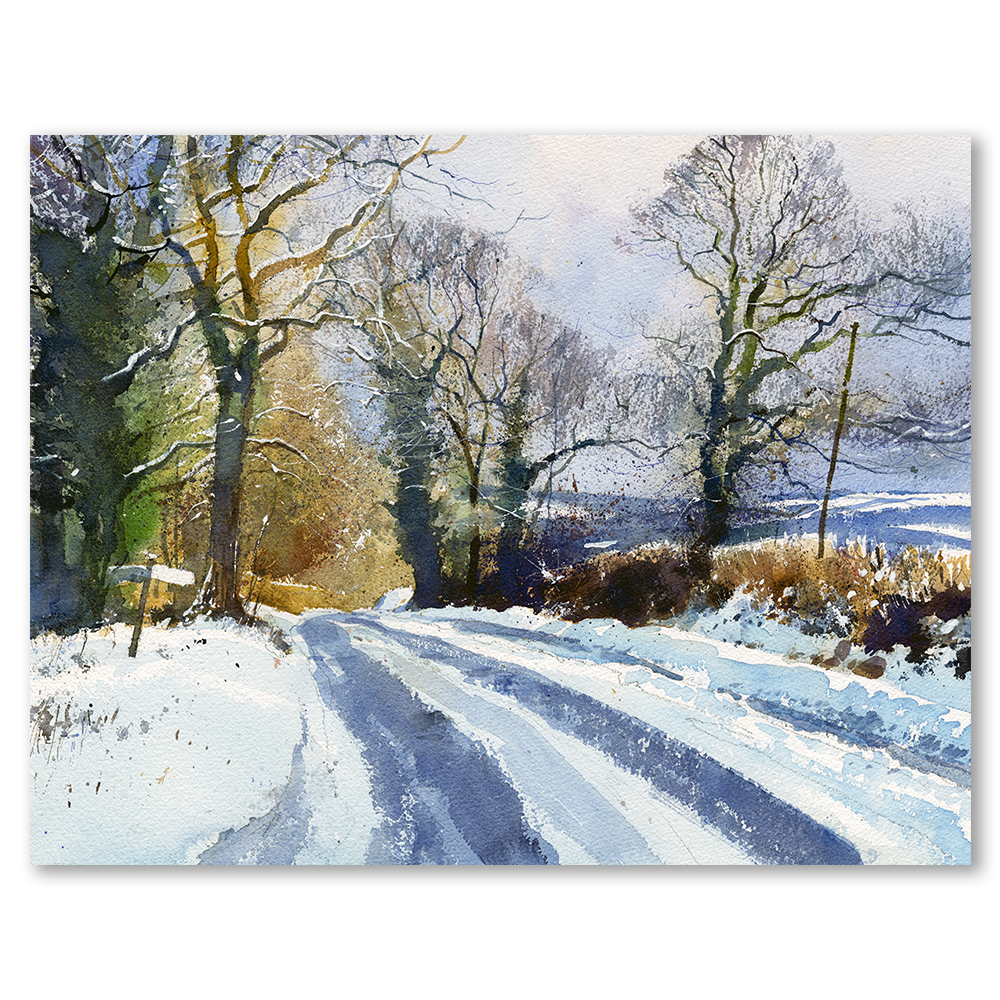“Evening Sets In,” a limited edition Giclée print by Richard Thorn, beautifully depicts the quiet allure of a winter’s evening. Soft snowfall blankets the landscape, while bare branches frame a serene sky. Harmonious tones and subtle shadows create depth, drawing the viewer into this wintry scene. Furthermore, the composition’s balance captures the essence of tranquillity.
