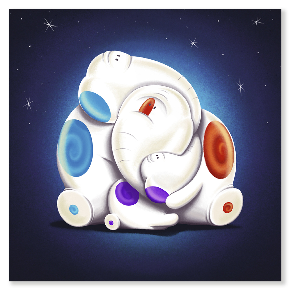 The art showcases two abstract creatures, seemingly a parent and child, in a gentle embrace. The larger figure wraps protectively around the smaller one. Each is accented with unique swirling spots. Their simple, yet expressive features evoke a sense of tenderness and care. Indeed, this touching composition creates a heartwarming scene.