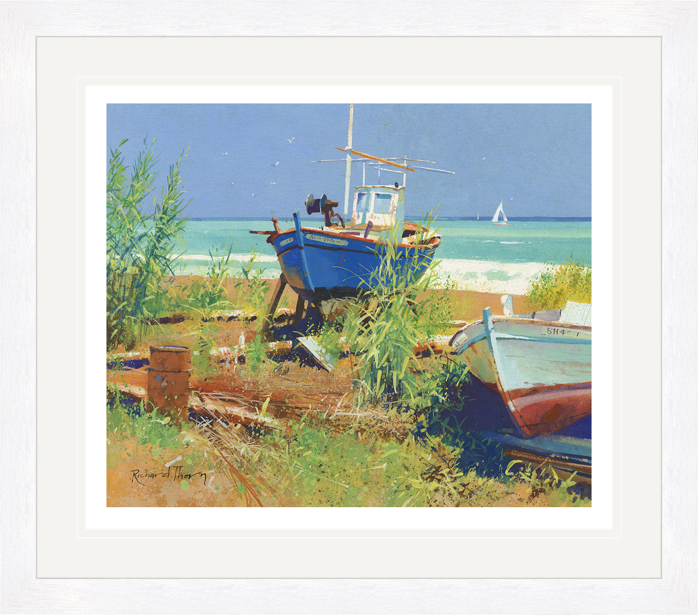 “In The Carribee,” a breath taking fine art limited edition Giclée print by Richard Thorn, transports you to an idyllic coastal scene. Radiant colours and meticulous details invite you to soak in the sun-kissed atmosphere. Thorn’s masterful strokes capture a serene moment by the seaside. Sailboats glide in the distance while vibrant greens frame the foreground’s rustic charm.