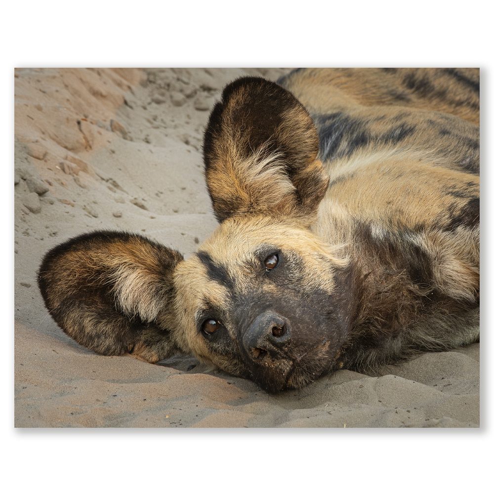 Fiona Haddon’s “Just Chillin’” captures a relaxed African wild dog, presented as a fine art Giclee print that exemplifies her ability to connect with wildlife. The artwork shows the wild dog lounging in the sand. The image tells a story of calm and peace. It also displays the natural beauty of the animal.
