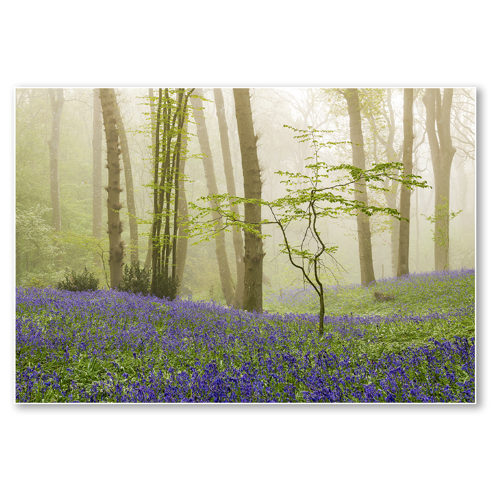 This captivating framed photograph transports you to a mystical woodland scene. A sea of vibrant bluebells stretches across the forest floor, creating a breath taking carpet of colour. Delicate blooms blanket the ground, their deep purple hues contrasting beautifully with the muted greens and browns of the surrounding trees.