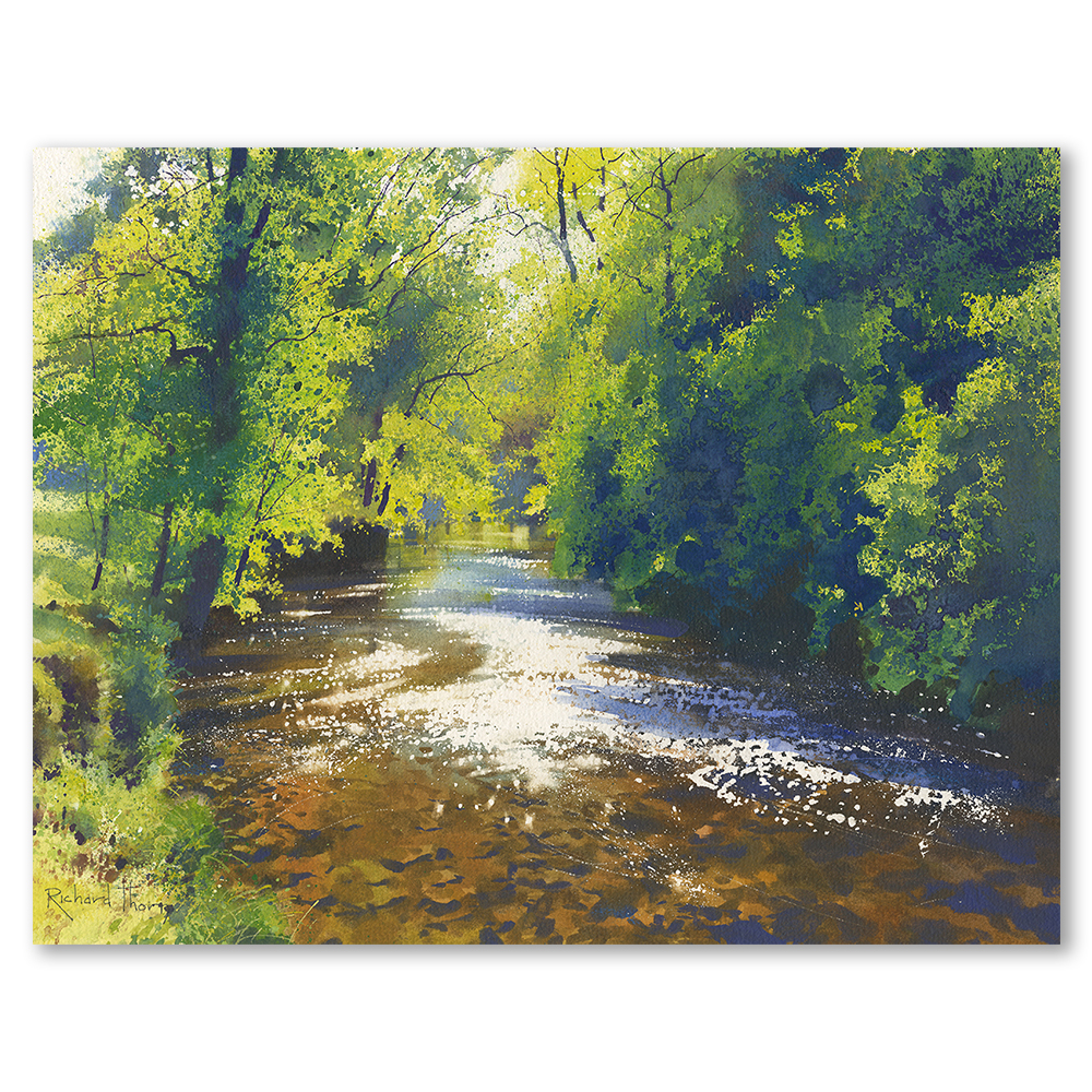 “Light on the River” by Richard Thorn exquisitely captures the serene beauty of a tranquil riverside scene. This limited edition Giclée print immerses the viewer in a lush tapestry of light and shadow. Sunlight dances upon the water, creating a mesmerizing interplay that draws the eye along the river’s gentle curve. Thorn’s skilled artistry conveys both the vibrancy and stillness of nature.