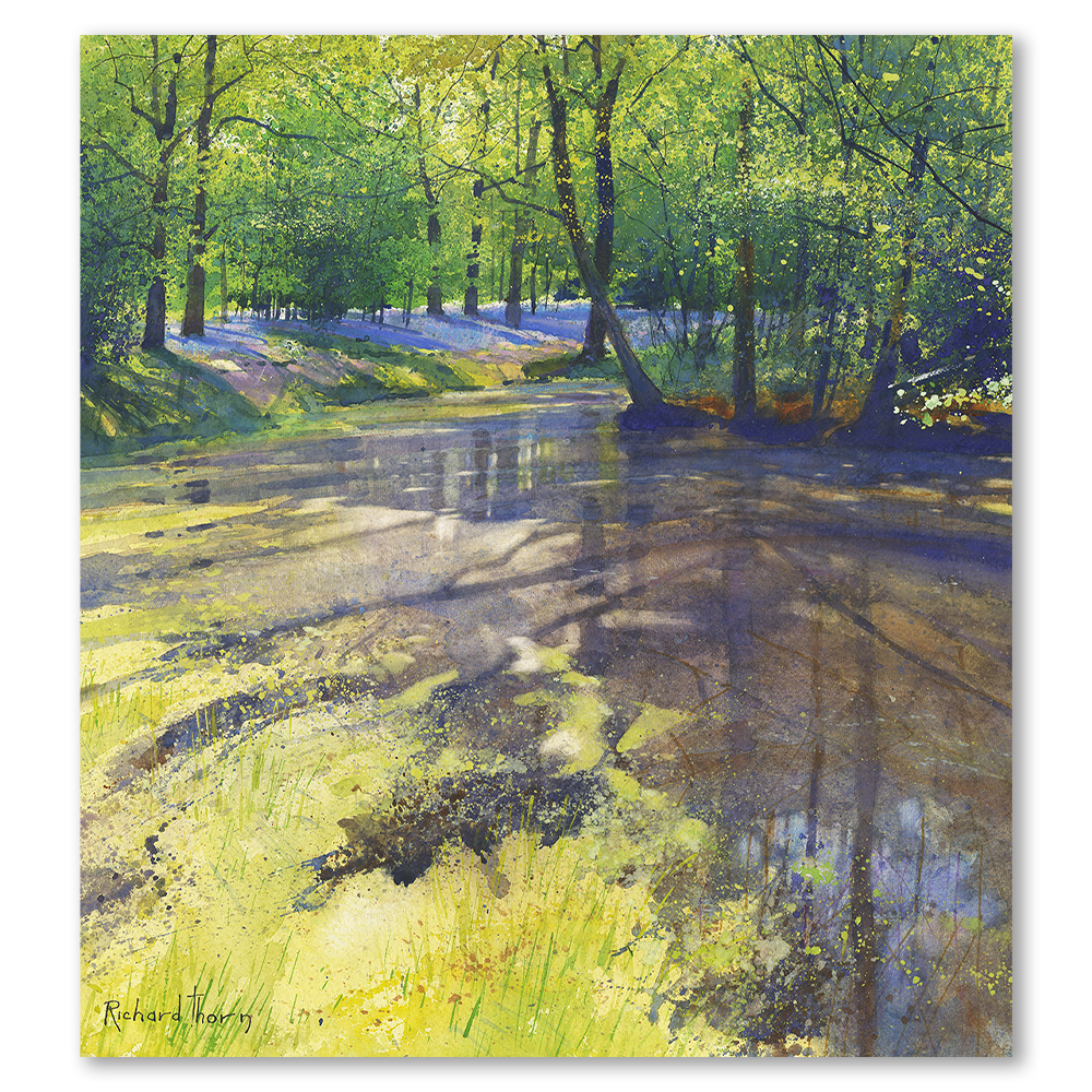 “Lower Pond at Beatons Wood” by Richard Thorn invites viewers into a serene woodland escape. This limited edition Giclée print masterfully captures the tranquil beauty of nature. Dappled sunlight dances across the pond’s surface, creating a harmonious blend of light and shadow. Thorn’s attention to detail brings the scene to life, enveloping the viewer in a peaceful forest ambiance.