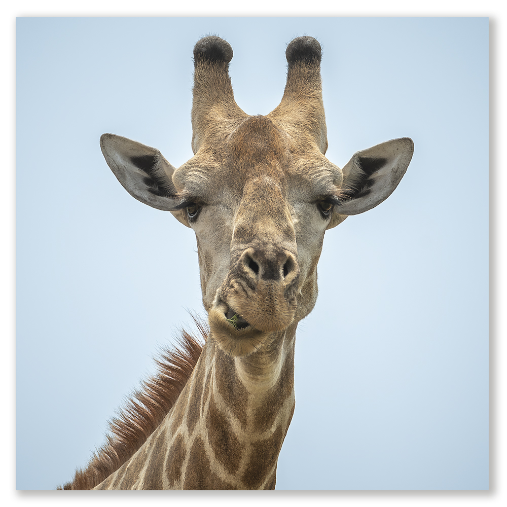 The giraffe’s head and neck occupy much of the composition, set against a serene, pale sky. The details of the giraffe’s face, from the dark, inquisitive eyes to the slight twist of its mouth, draw the viewer closer, creating a personal connection. However, the detail of its mane brings it into sharp focus. Because of Haddon’s skill the viewer can almost hear the munching of food.