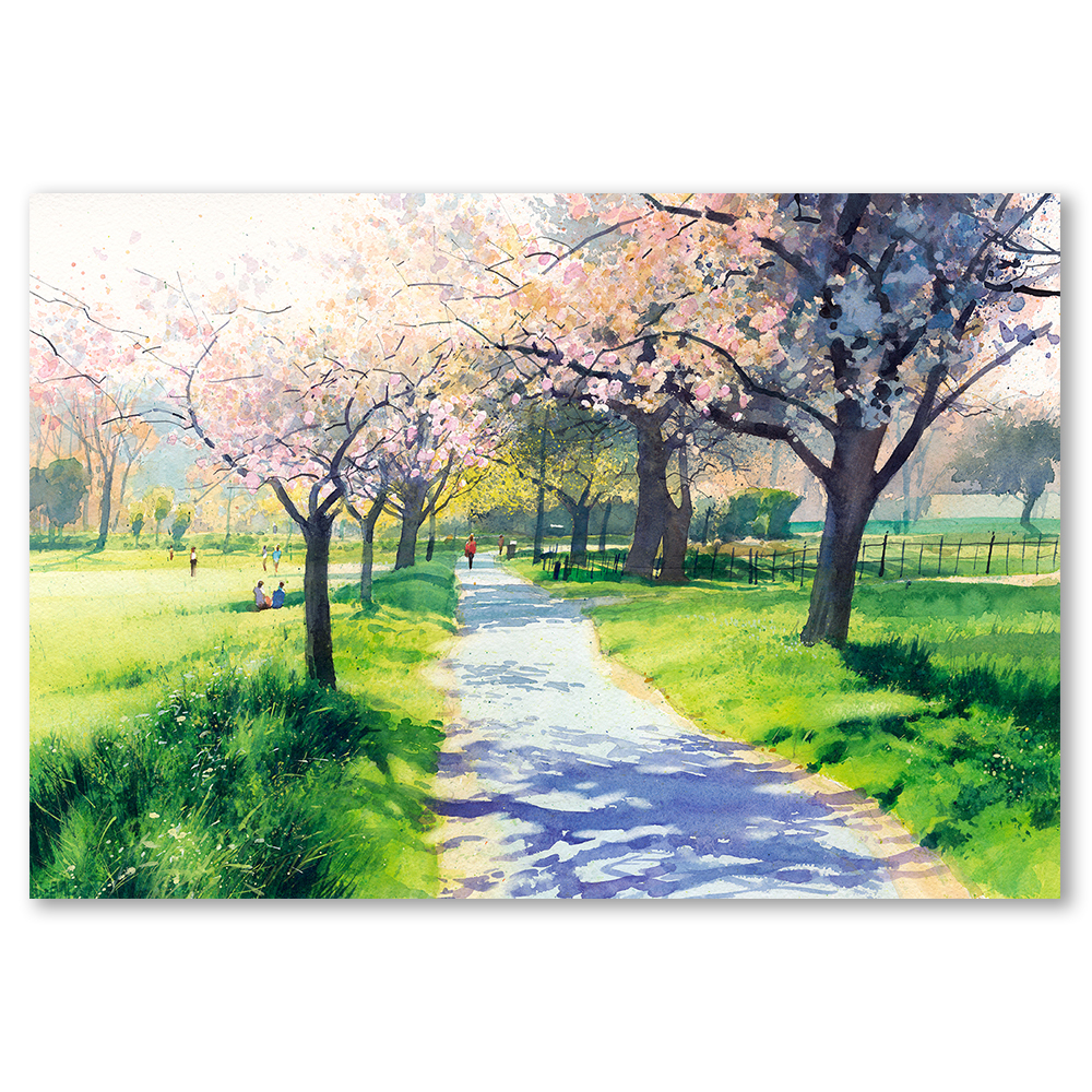 Richard Thorn’s “Meadow Walk Torre Abbey” delivers a serene yet vibrant portrayal of nature’s grace. The giclée print masterfully captures the essence of a sunlit path flanked by blossoming trees, inviting viewers into a moment of tranquil beauty. As sunlight dances through the branches, it casts delicate, playful shadows along the path, creating a harmonious blend of light and colour.