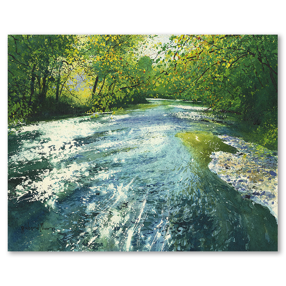 Richard Thorn’s “November on the Teign” evokes the tranquil beauty of an autumn landscape. This giclée print presents a serene river, gracefully winding through a canopy of vibrant foliage. Sunlight dapples the water, creating a shimmering tapestry of colour and light.