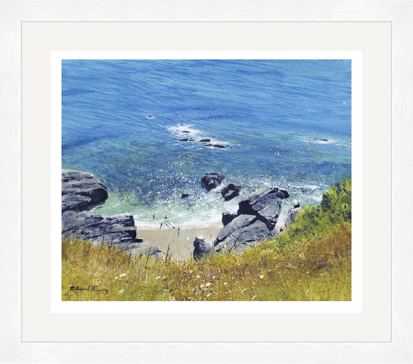 Thorn’s skilful use of colour brings the scene to life, transitioning seamlessly from deep ocean blues to the warm hues of the beach. The intricate detail of the rocky coastline adds depth and texture. As a result, viewers are drawn into a peaceful and contemplative moment.