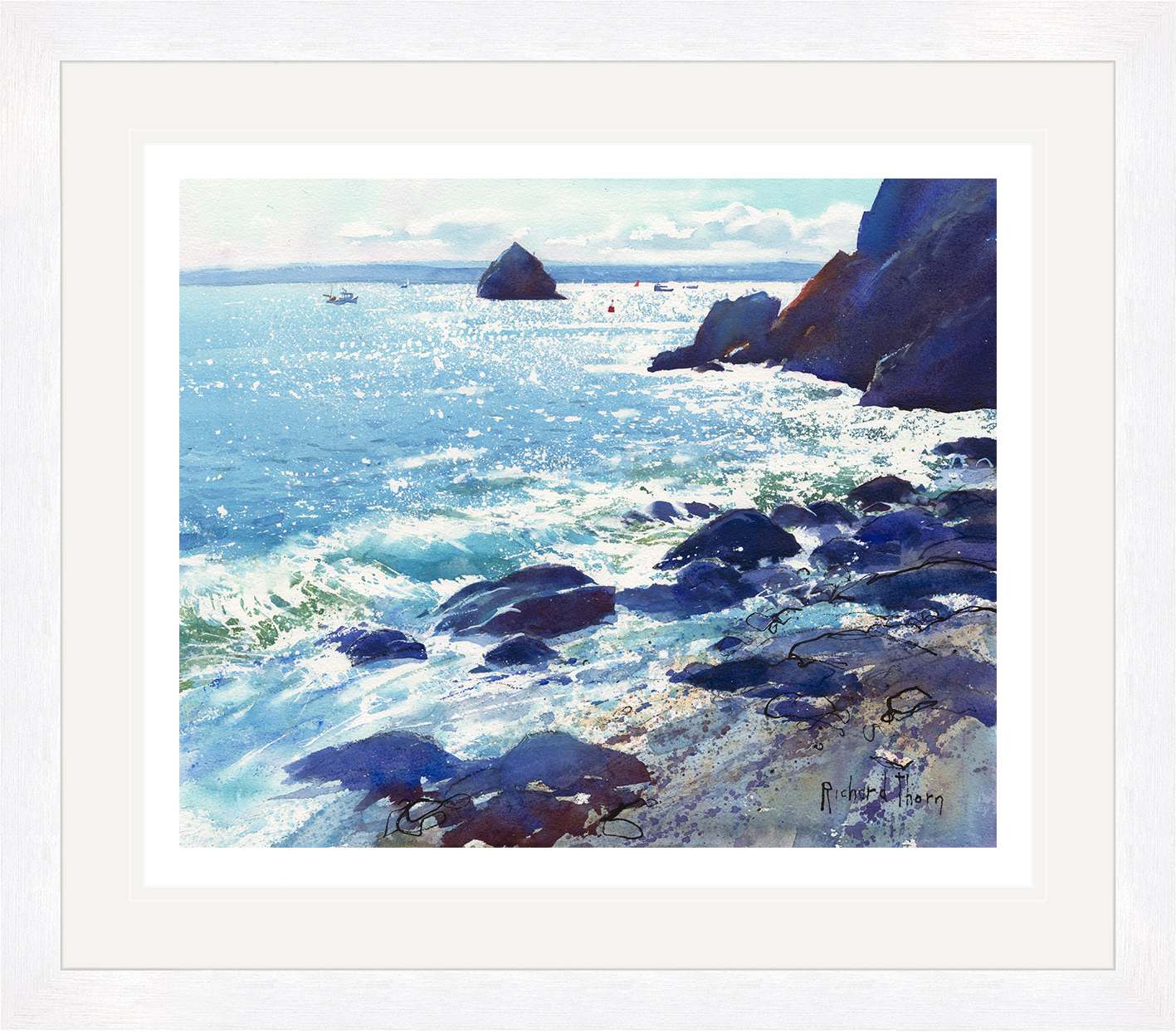 Richard Thorn’s “On the Evening Tide” captures the serene beauty of a coastal evening. This giclée print presents a tranquil seascape where waves gently lap against the shore. The shimmering light of sunset dances on the water, creating a harmonious blend of colours.