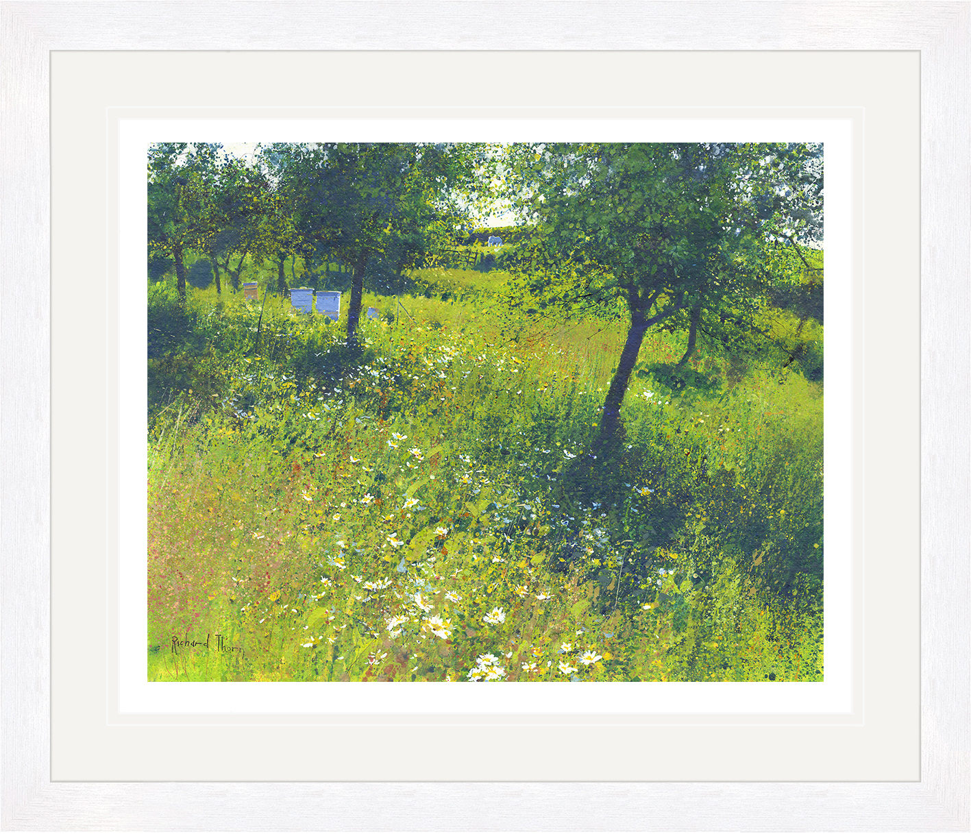 “Orchard Gold” by Richard Thorn epitomises the serene beauty of the countryside. This fine art Giclée print captures an orchard bathed in sunlight, where the lush greenery merges with vivid splashes of yellow and white flowers. Transitioning seamlessly from one element to another, Thorn’s delicate brushwork brings the scene to life. Observers will notice the subtle inclusion of bee hives, which convey a sense of harmony and industrious tranquillity. These hives, nestled amidst the trees, emphasise the balance between nature and its diligent inhabitants.