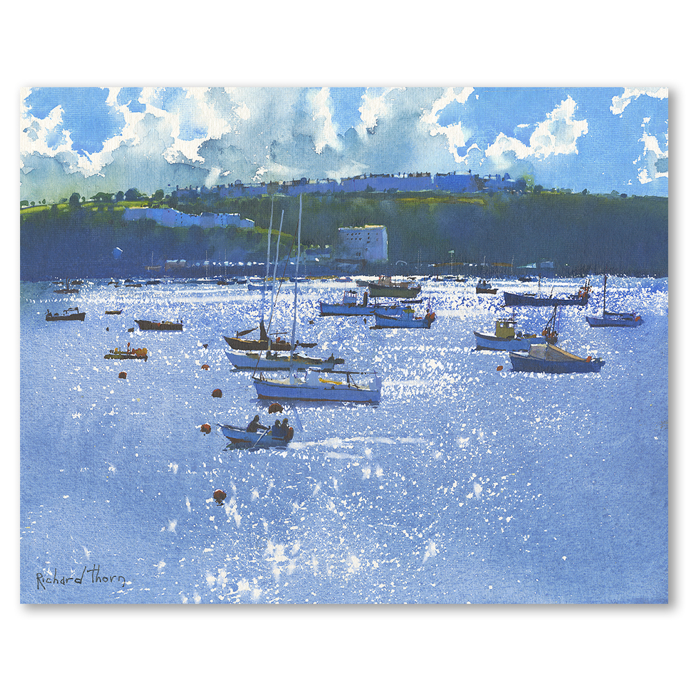 “Overgang Brixham” by Richard Thorn exquisitely captures the charm of a bustling harbour. This fine art Giclée print portrays boats gently swaying under the sparkling sunlight, with the sea shimmering brilliantly. Thorn’s masterful use of light and rich colours brings this lively scene to life, inviting viewers to feel the coastal ambiance. Moreover, the intricate details of the boats and water create a captivating visual narrative.
