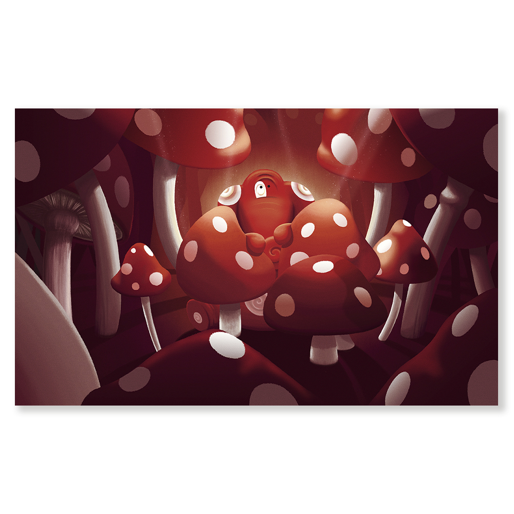 The artwork presents a red creature surrounded by towering red and white spotted mushrooms. The density of the mushrooms creates a sense of depth. Indeed, the scene makes viewers feel as though they are looking into a hidden world. Therefore, the artwork invites one to step into a whimsical forest.