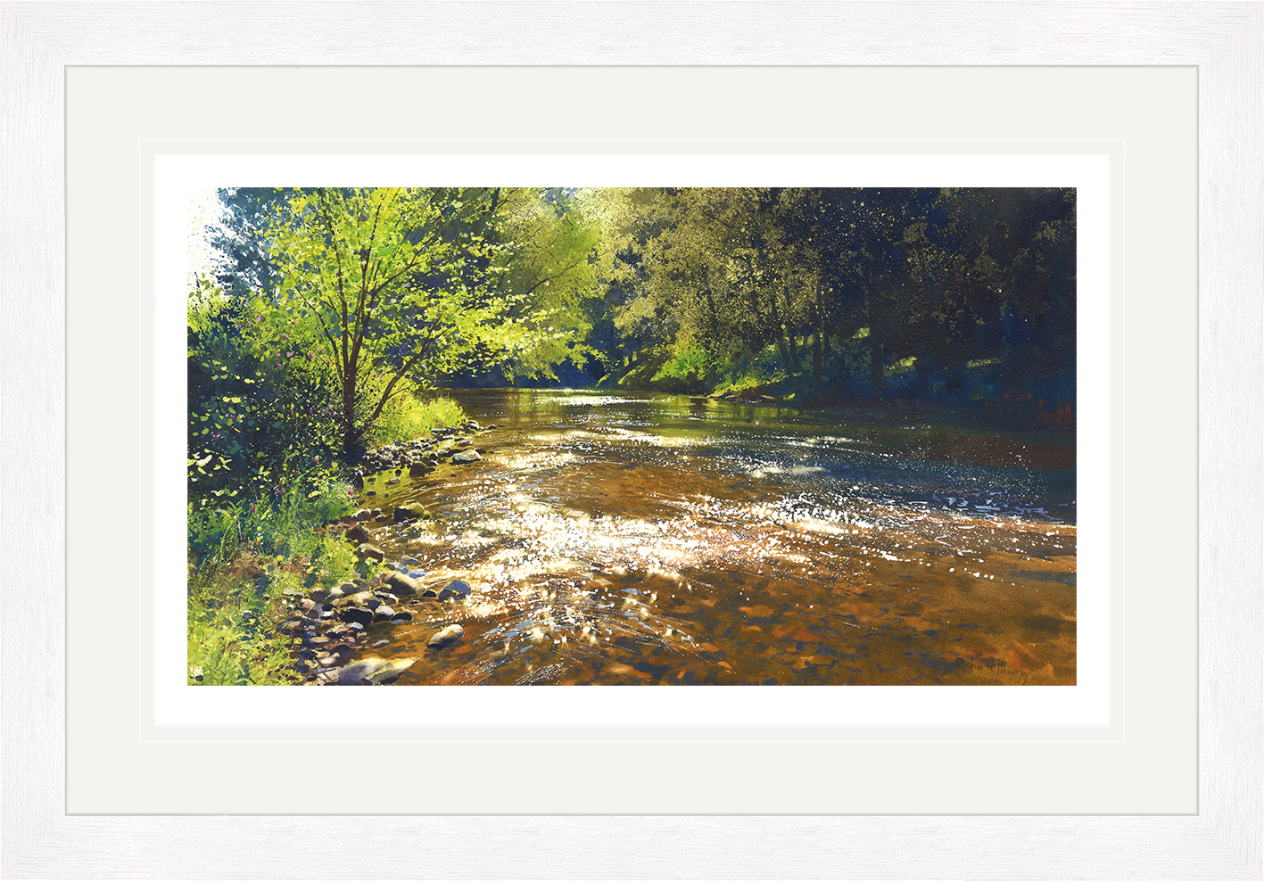 “River Calm” by Richard Thorn is a captivating giclée print that envelops viewers with its serene atmosphere. The scene depicts a tranquil river flowing gently under the dappled sunlight, surrounded by lush greenery. With vibrant colours and exquisite detail, Thorn’s work invites contemplation and peace.