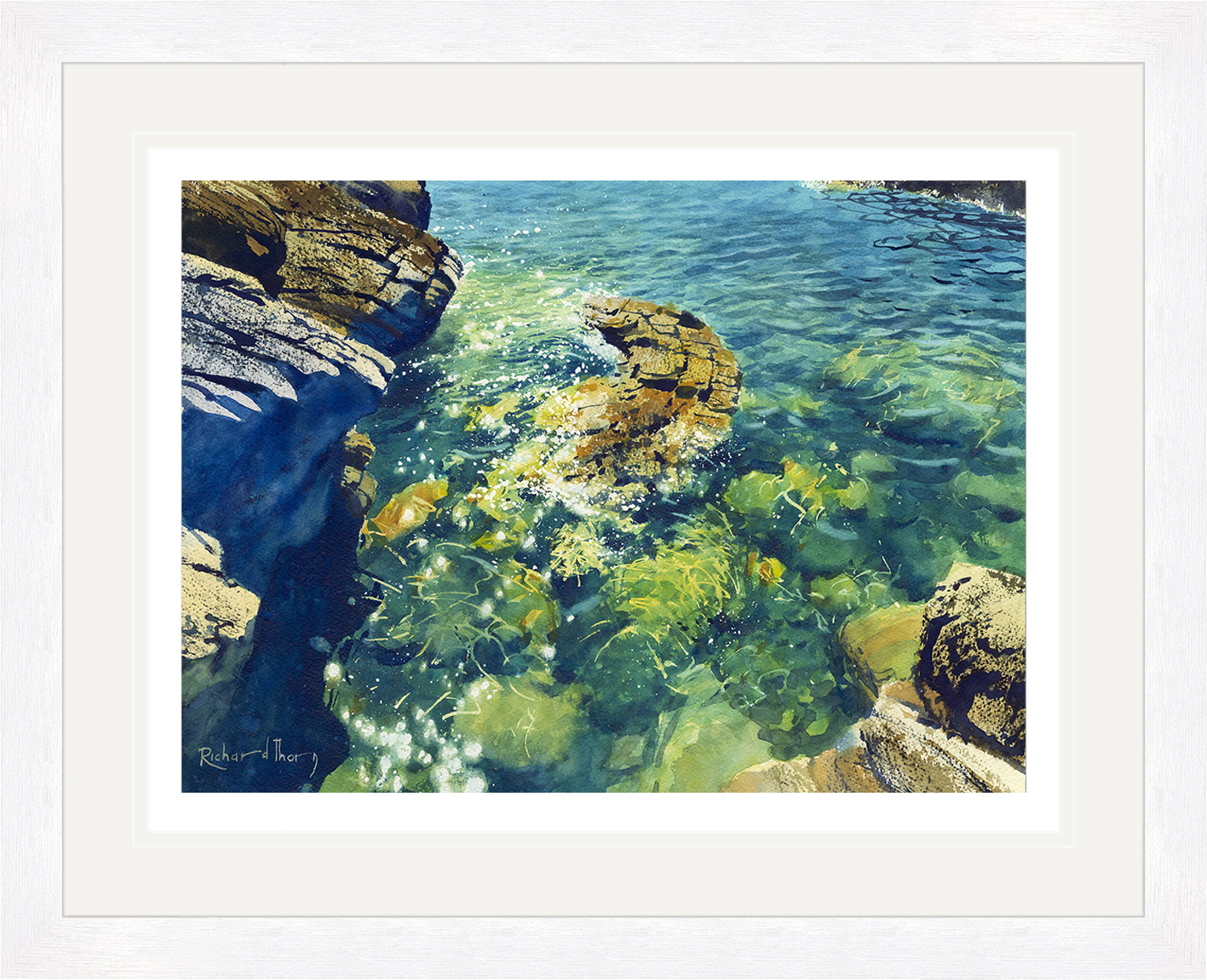 “Sea Jewels Two” by Richard Thorn is a breathtaking giclée print that immerses viewers in the radiant beauty of the sea. This masterpiece unveils a vibrant underwater world where sunlight sparkles across turquoise waters and rocky formations. With its exquisite detail, the piece captures the enchanting dance of light and colour.