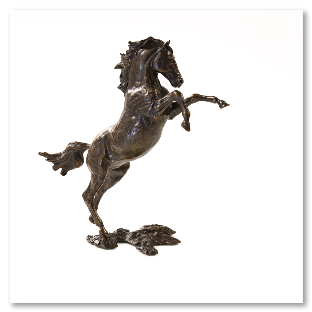 This imposing “Shadow Large Horse” sculpture, expertly crafted in solid bronze by Richard Cooper Bronzes, captures the power and grace of a horse rearing up. As a fine art limited edition piece, it presents a unique opportunity to own a magnificent bronze sculpture. The sculpture depicts a muscular horse in a rearing position.