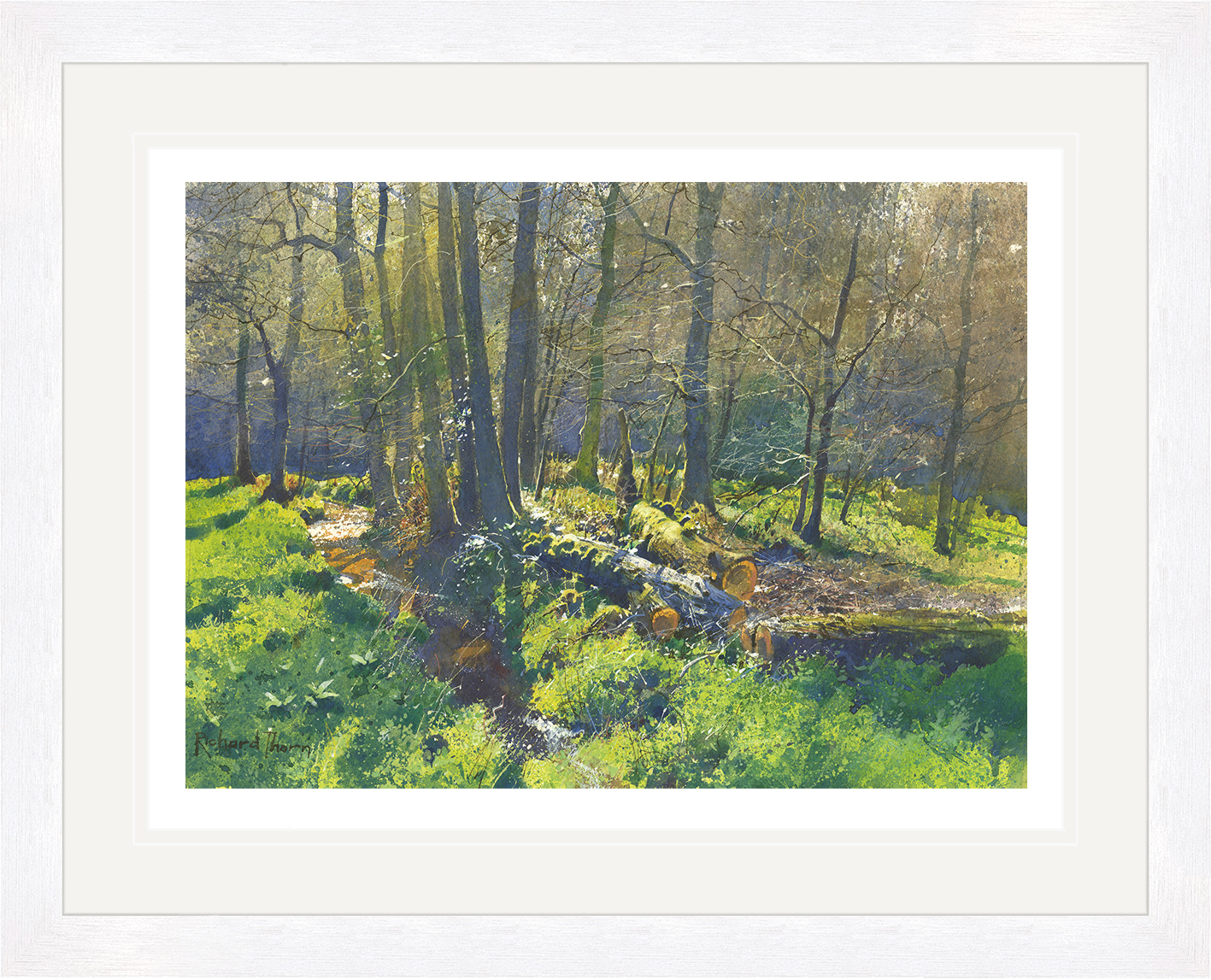 “Slumber Woods,” a limited edition Giclée print by Richard Thorn, captivates with its serene depiction of a tranquil forest. The painting invites viewers to step into a world where sunlight dances through the branches, casting playful patterns on the forest floor. Soft hues of green and gold blend effortlessly, creating an atmosphere of peace and reflection.