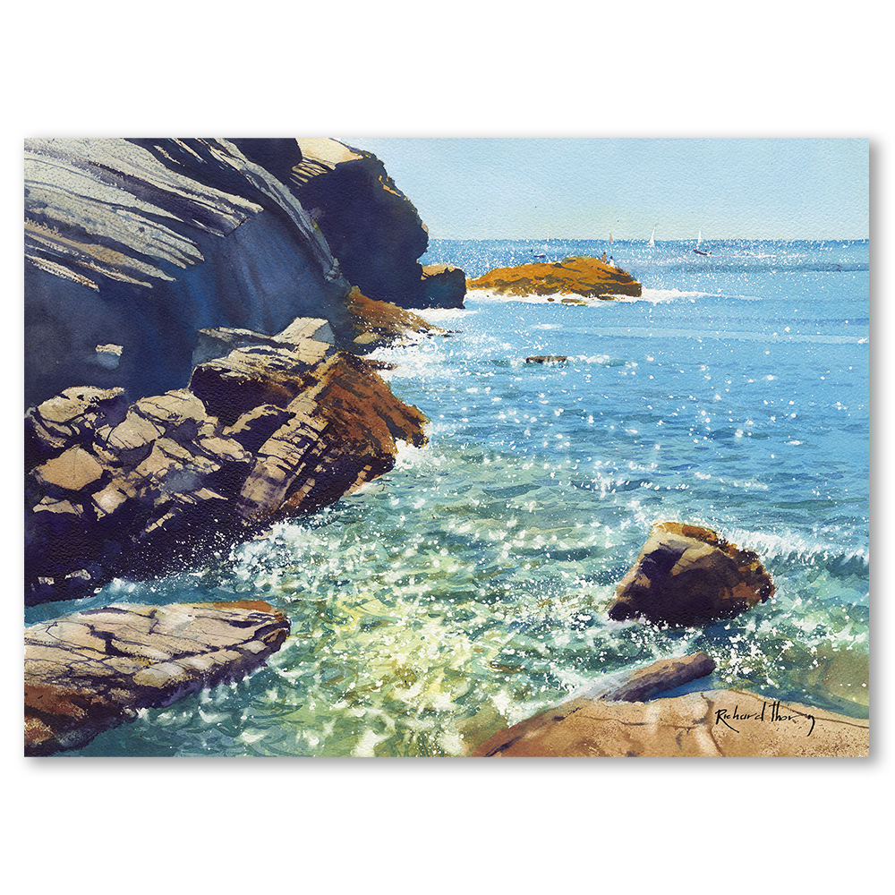 “Summer Sparkle” by Richard Thorn captures the dazzling beauty of the coast in this limited edition Giclée print. Sunlight glistens on the azure waves, casting shimmering reflections across the scene. The intricate details invite viewers to immerse themselves in a world of tranquillity and warmth.