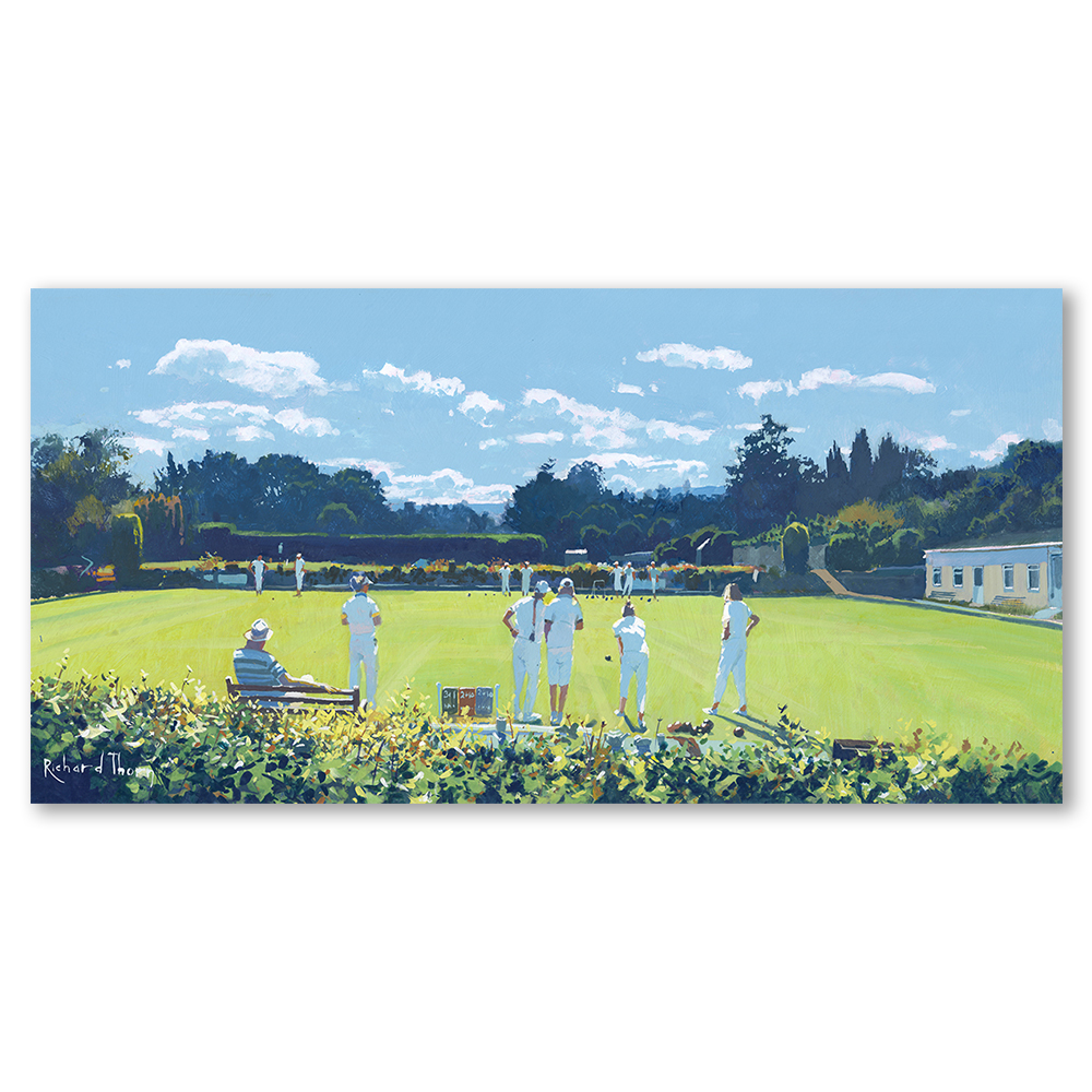 “Tactics” by Richard Thorn explores the art of strategy in this limited edition Giclée print. A tranquil lawn bowls scene unfolds under a cloud-dotted sky, where players discuss their next moves. The artwork invites viewers into a world where thought meets leisure.