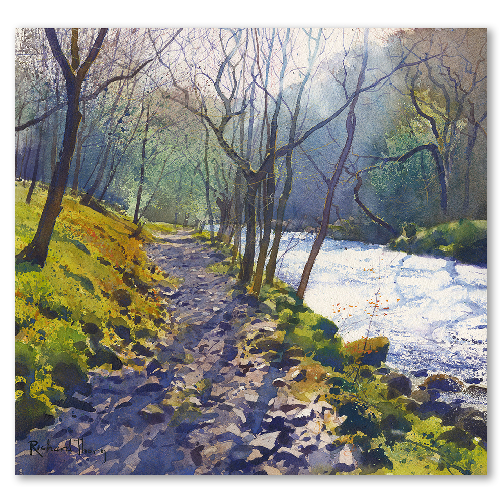 “The Beaten Track” by Richard Thorn captivates with its serene beauty. This fine art limited edition Giclee print showcases a tranquil path winding through a lush, sun-dappled forest. Sunlight filters through the trees, casting playful shadows on the rocky path, and the gentle curve of the river adds a sense of movement.