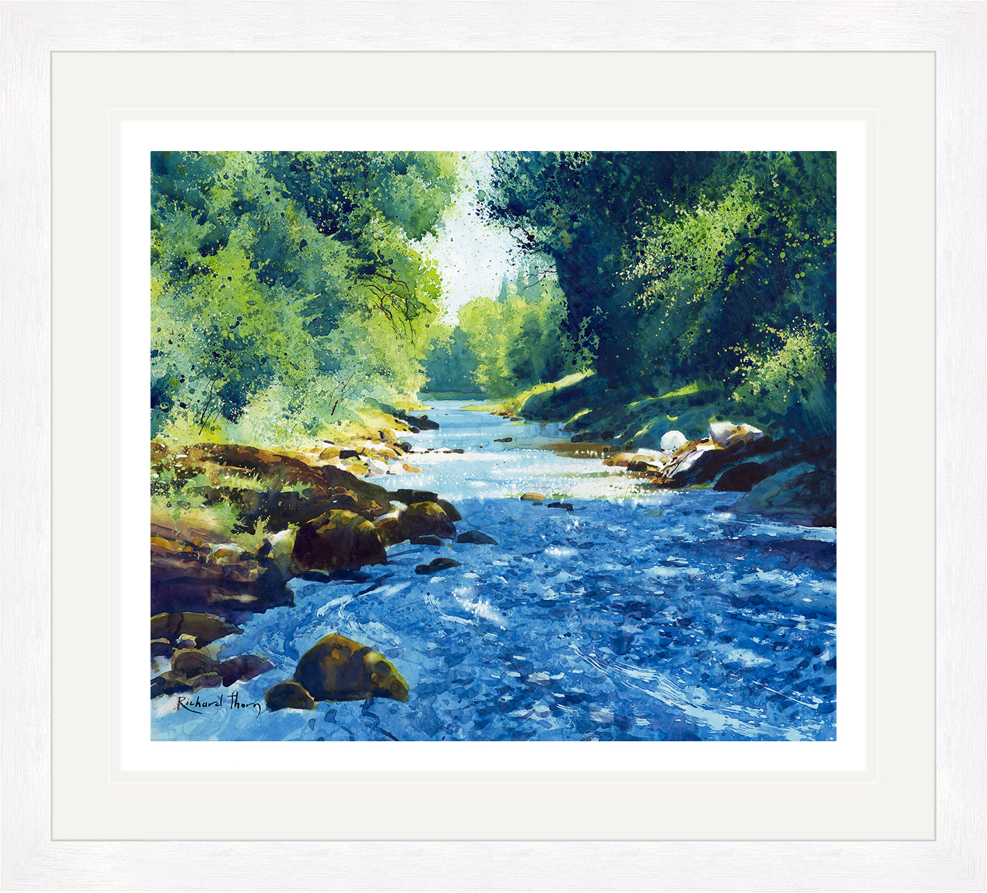 “The Blue Teign” by Richard Thorn captures the serenity of a flowing river with captivating detail. This fine art limited edition Giclee print showcases the beauty of nature, as sunlight sparkles on the water and dances through lush greenery. The piece invites viewers to immerse themselves in the tranquil atmosphere.