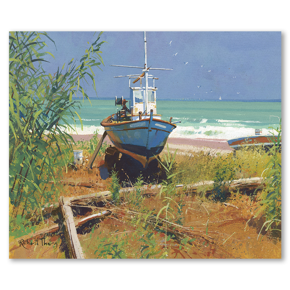 “The Caribee” by Richard Thorn beautifully captures the essence of a seaside retreat. This fine art limited edition Giclee print unveils a tranquil scene, where a lone boat rests on the sandy shore, framed by lush greenery. Gentle waves ripple in the background, drawing viewers into a world of peace and calm.