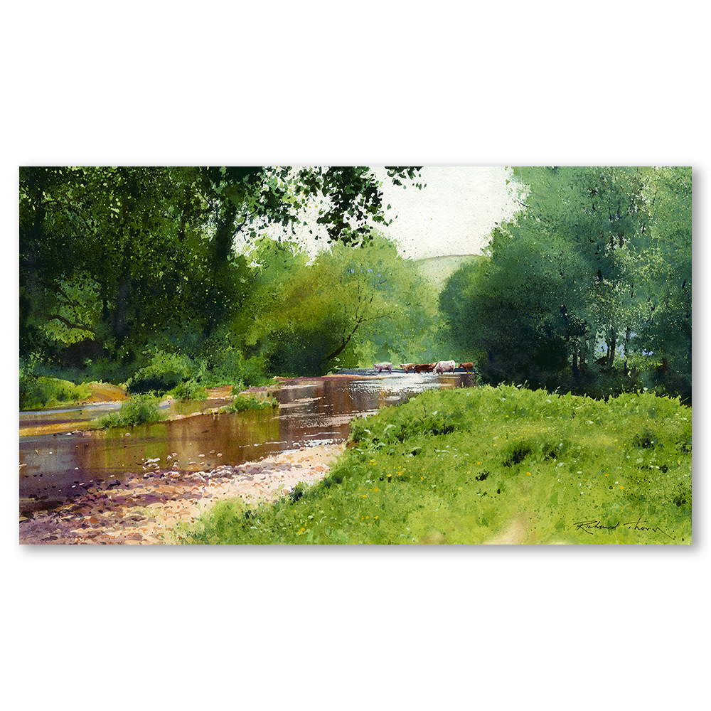 “The Grass is Greener” by Richard Thorn offers a captivating portrayal of nature’s tranquillity. This fine art limited edition Giclee print unveils a serene landscape, where lush pastures meet a gentle river, inviting viewers to lose themselves in its peaceful charm. Cows graze leisurely, adding a touch of idyllic life to the scene.