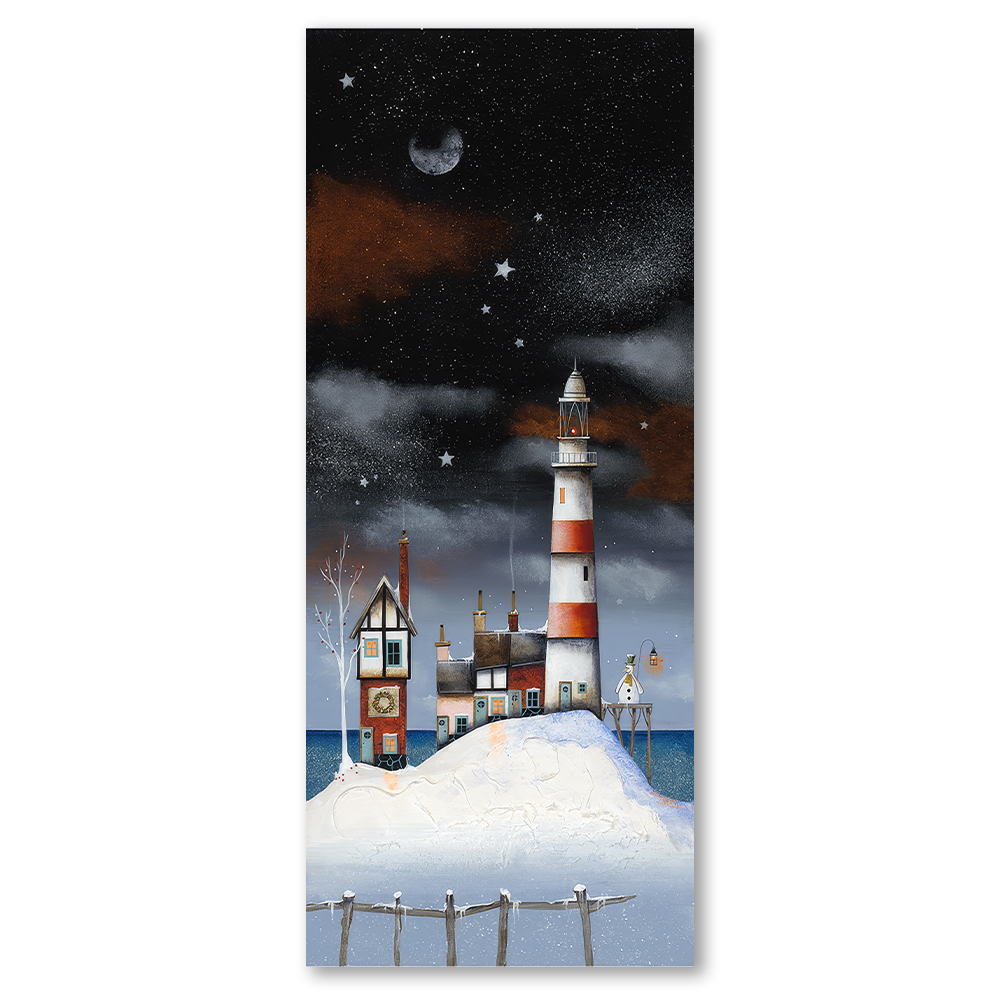 This captivating Giclée print by Gary Walton depicts a charming winter scene. A quaint village nestles on a snow-dusted hilltop, overlooking a calm sea. The houses glow warmly, contrasting beautifully with the dark night sky. Moreover, a tall lighthouse stands proudly, its light a beacon in the darkness.
