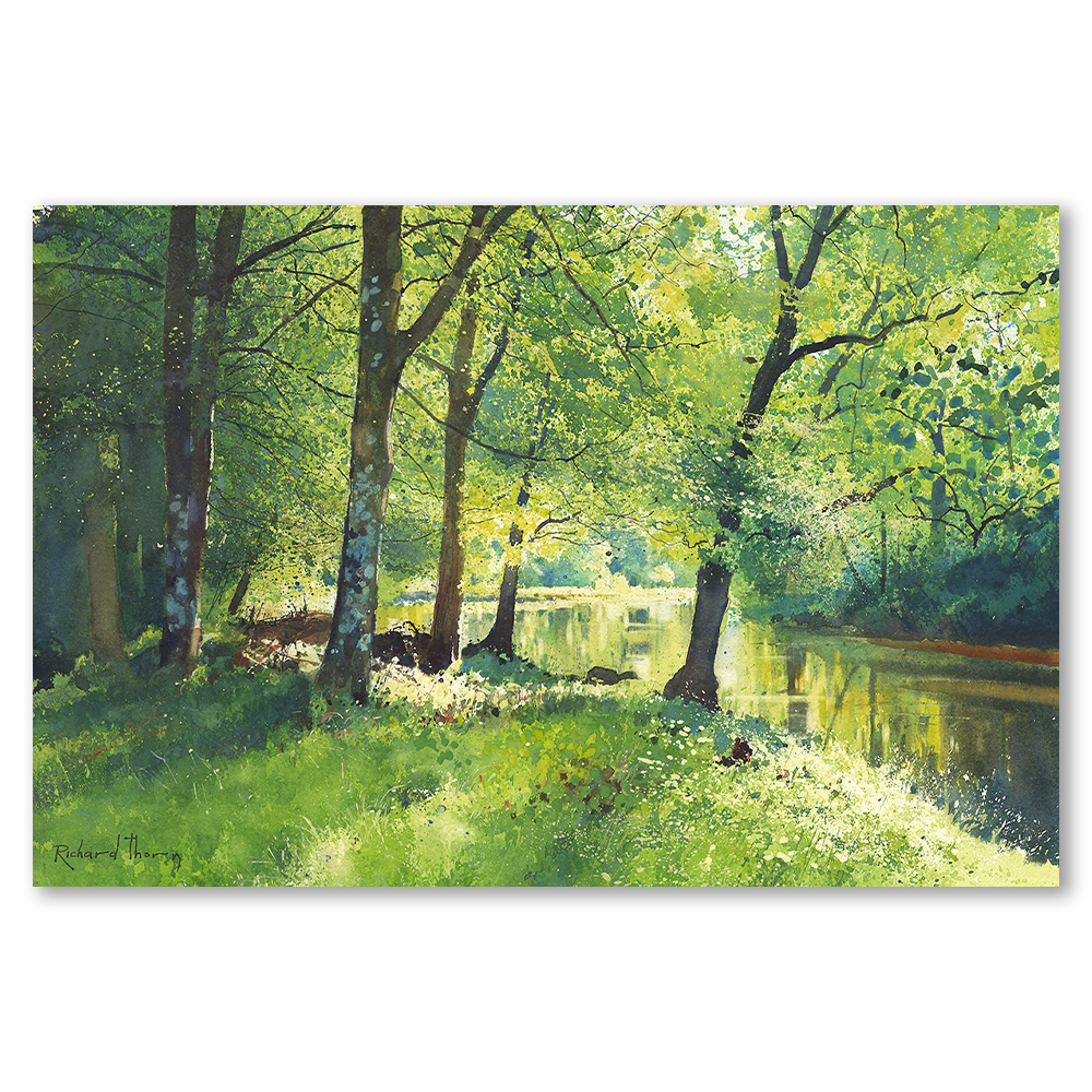 Sunlight filters through lush trees, casting intricate shadows on the landscape. Meanwhile, the serene water reflects the verdant beauty surrounding it. Thorn’s exquisite detail and vibrant colours bring this tranquil scene to life.