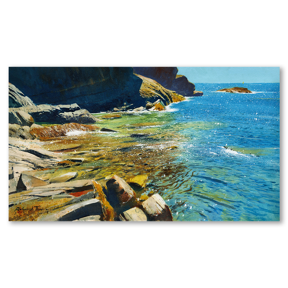 Richard Thorn’s “Tide and Time” portrays a serene coastline, where shimmering light and gentle waves meet rugged rocks. The print is a testament to Thorn’s skill in capturing the ever-changing essence of the sea. Vibrant blues and earthy tones create a harmonious balance, drawing the viewer into a world where water dances over stone.