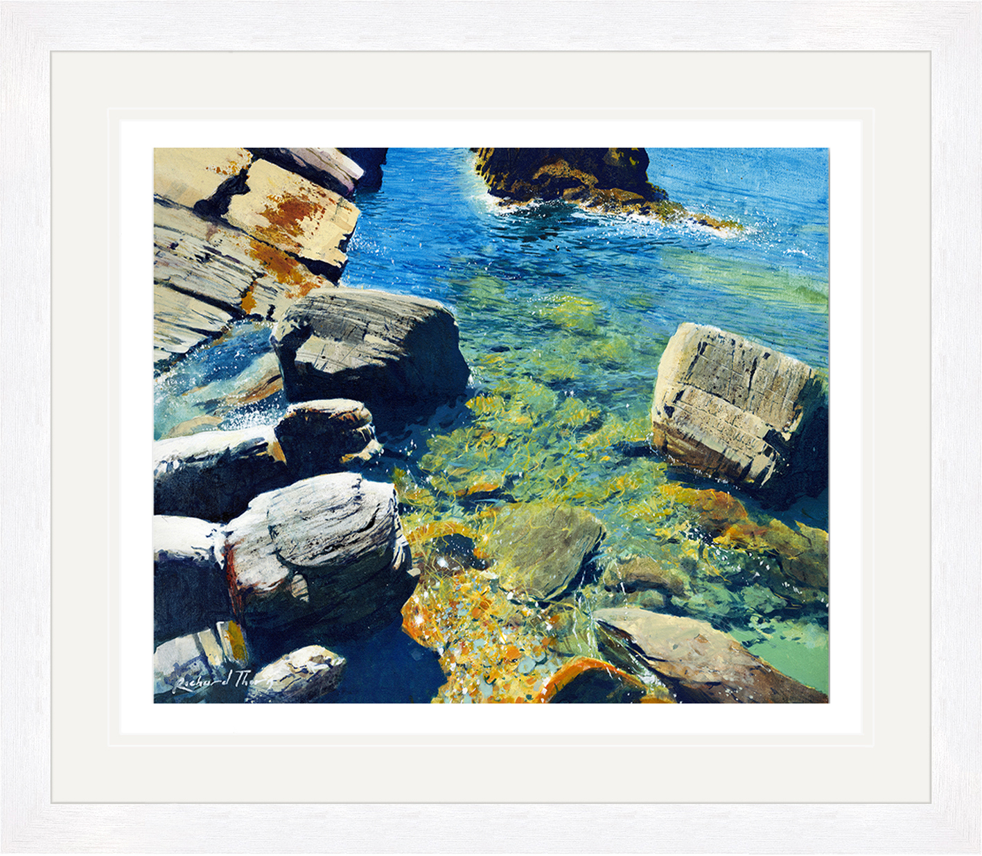 Crafted as a limited edition Giclée, this piece showcases exceptional detail and vibrant colours. The fine framing enhances its sophisticated allure, making it a stunning addition to any space. Every element invites appreciation, from the shimmer of the waves to the texture of the stones.