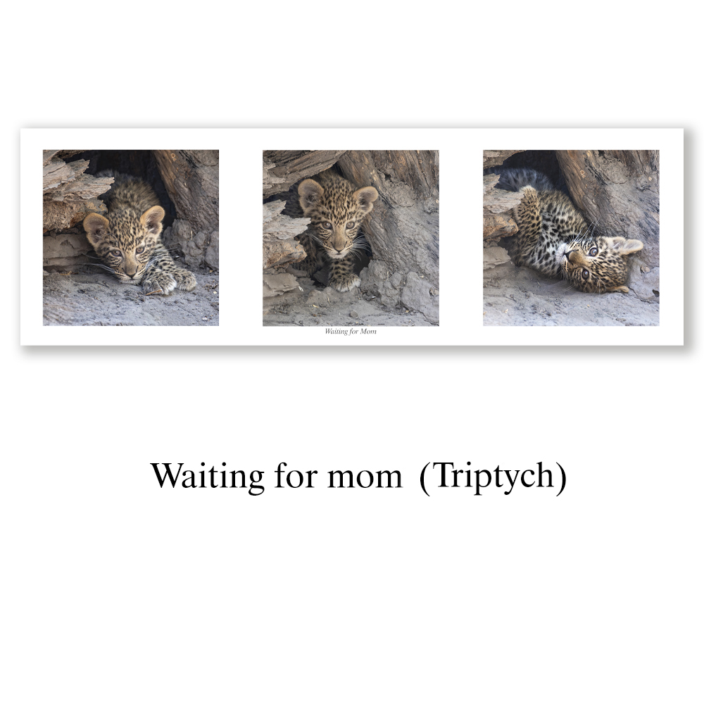 Fiona Haddon presents “Waiting for Mom”, a moving triptych comprising three evocative images: “Missing Mom,” “Peekaboo,” and “Mom’s Pride and Joy”. Displayed together as a single Giclee print, these images work together, showcasing the multifaceted life of a leopard cub. It is a story of curiosity, yearning, and playfulness. The triptych celebrates the universal themes of family and childhood.