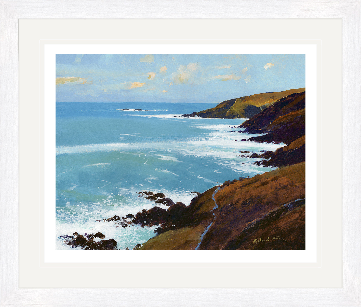 Richard Thorn’s “Zenor Surf” invites viewers to experience the majestic beauty of waves crashing against a rugged shoreline. The Giclée print captures the vibrant blues and dynamic energy of the sea. Thorn’s artistry conveys a sense of tranquillity intertwined with nature’s raw power.